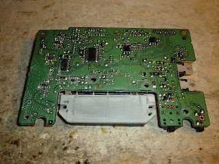 Nachfolgend wurde die Wärmeleitpaste entfernt und die Platine auf fehlerhafte Kontakte kontrolliert werden.Neben vielen kalten Lötstellen wurden unter aufgekochtem Platinenlack zwei durchgebrannte Leiterbahnen in der Nähe der NF-Stufen festgestellt.